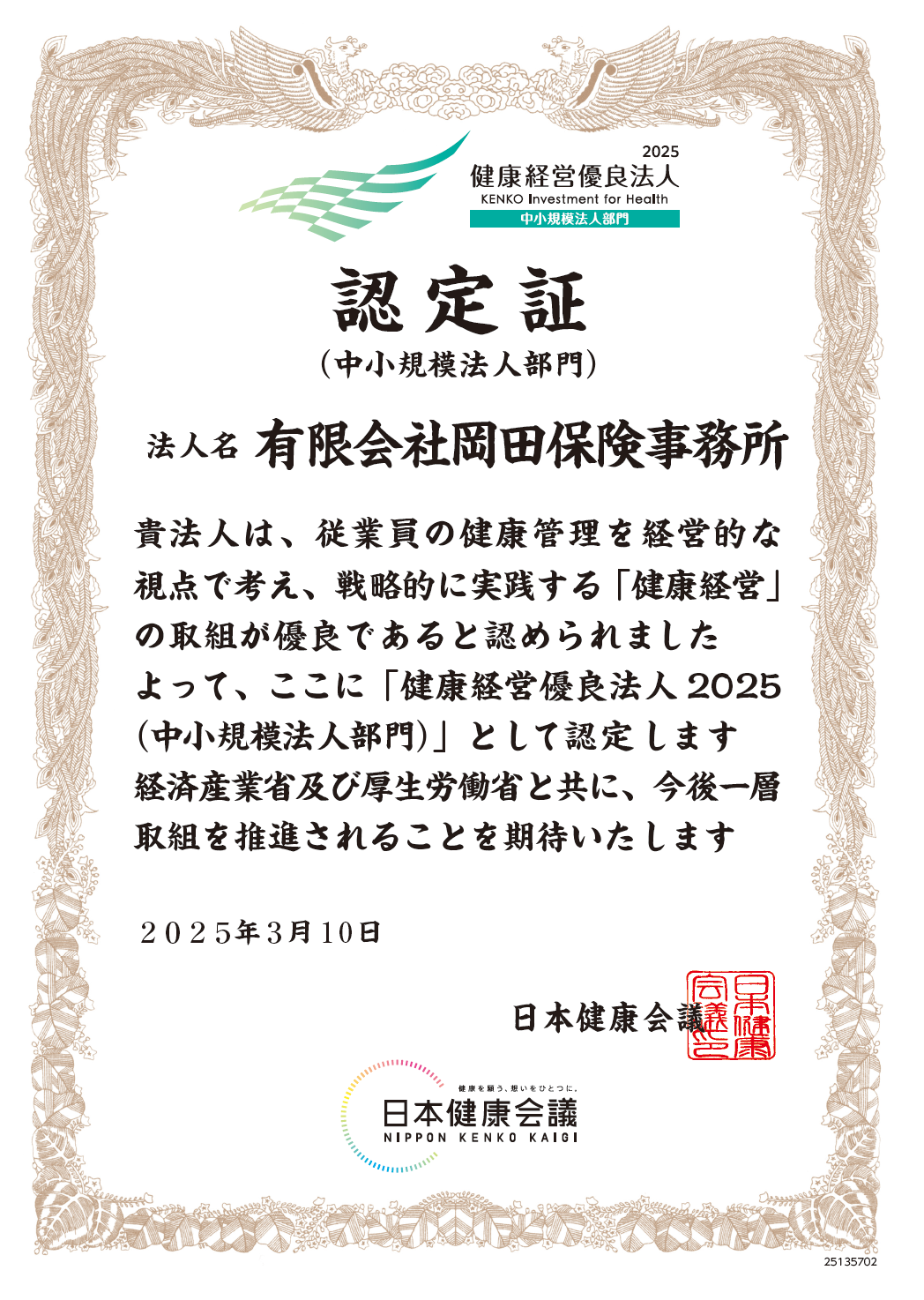 2025.03.10 お知らせ 健康経営優良法人2025(中小規模法人部門)に認定されました! 当社が健康経営優良法人2025(中小規模法人部門)として認定されました。今後もお客様のお役に立てるよう日々精進してまいりますので、引き続きどうぞよろしくお願いいたします。